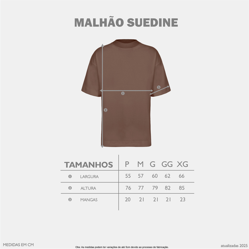 Camiseta Malhão Suedine Oversized Descubra a união perfeita entre robustez e sofisticação com a Camiseta Malhão Suedine Oversized. Confeccionada em malha com gramatura de 230 g/m², essa peça foi desenvolvida para oferecer qualidade e durabilidade excepcionais, ideal para o dia a dia urbano. Qualidade Superior: A malha Suedine, aliada à alta gramatura, garante um toque macio e resistência, mantendo a forma mesmo após múltiplas lavagens. Modelagem Oversized: Com um caimento perfeito, a camiseta proporciona conforto sem abrir mão de um estilo moderno e despojado, pensado para o público urbano. Detalhe Exclusivo: A gola canelada 2×1 com 3,5 cm, confere um toque refinado e contemporâneo, destacando o design único e inovador da peça. Versatilidade no Estilo: Ideal para compor desde looks casuais até produções mais ousadas, a Camiseta Malhão Suedine Oversized se torna um item indispensável para quem valoriza autenticidade e personalidade no vestuário. Eleve seu guarda-roupa com a Camiseta Malhão Suedine Oversized e experimente o equilÃbrio ideal entre conforto, durabilidade e design contemporâneo, feita especialmente para os amantes do estilo urbano.